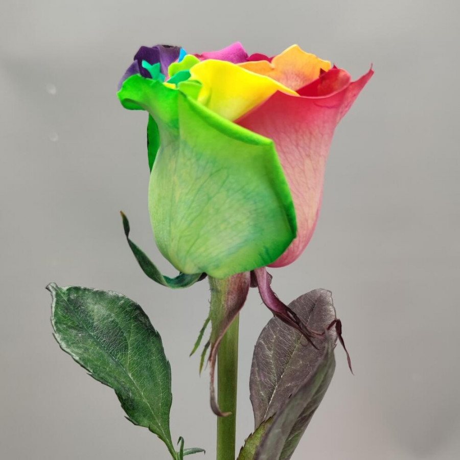 На фото радужная роза 1 штука. В составе: роза 1 шт, . Все цветы свежие и ароматные, букет красиво оформлен и отлично подходит для подарка. Доступна доставка цветов или самовывоз.